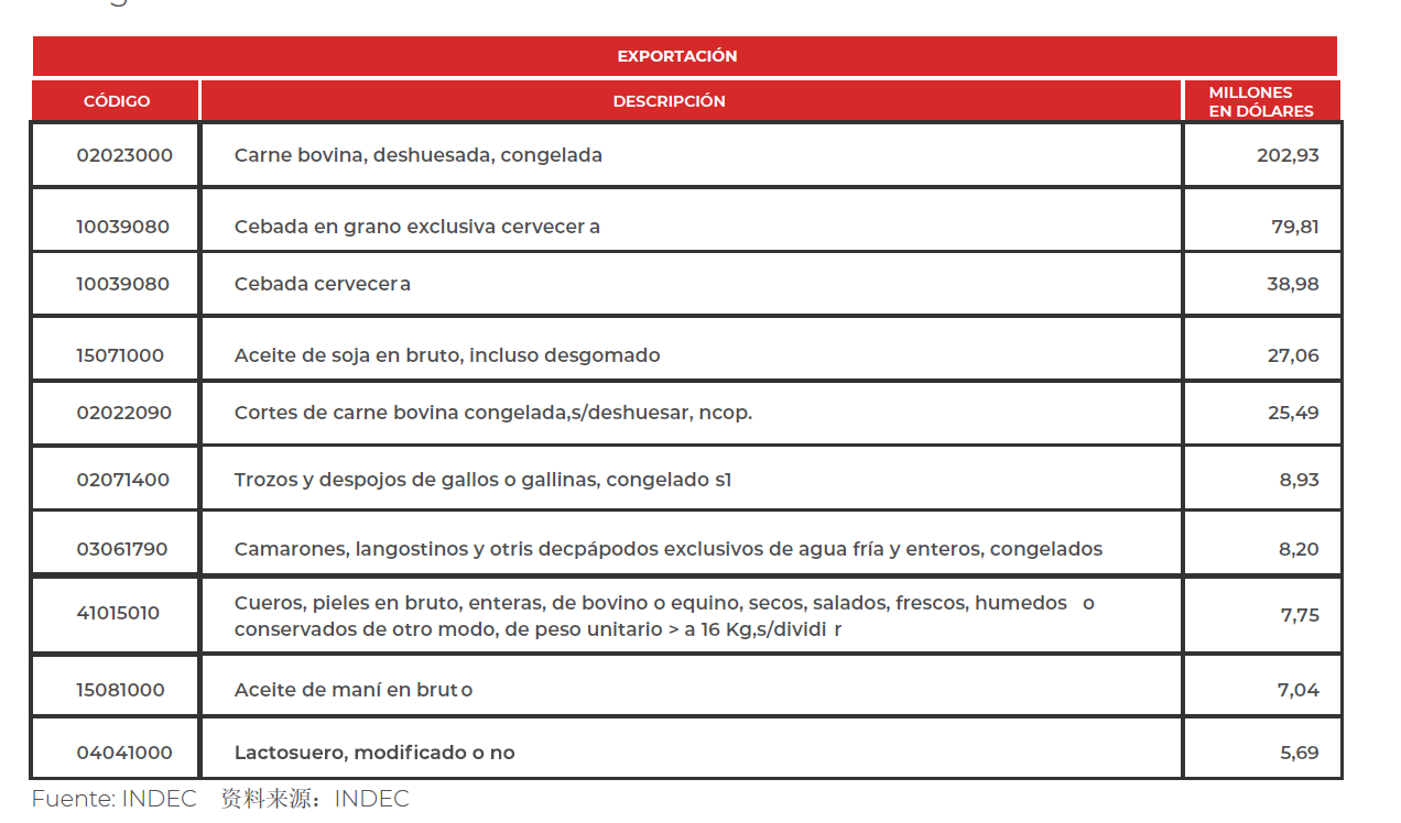 - Carne bovina, deshuesada y congelada: con aproximadamente 1.500 millones de dólares, representando el 30,34% del monto exportado;