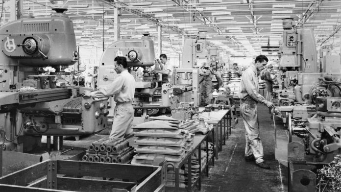 Operarios en la planta de Fiat Someca, en la década del sesenta. / Archivo General de la Nación