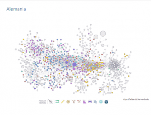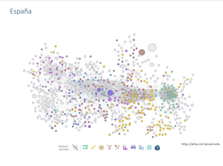Los productos mas básicos son los que están mas en la periferia, los primarios. En el centro están los mas complejos. Se unen por líneas y estos últimos reciben como insumos a los productos de la periferia. Por ejemplo: Minerales, químicos, materiales, fibras, tela, ropa . Cada color es un rubro. Los servicios no están incluidos. Así podemos ver como ocupa el mapa de productos en cada país. Lo coloreado es lo que produce y comercia un país.